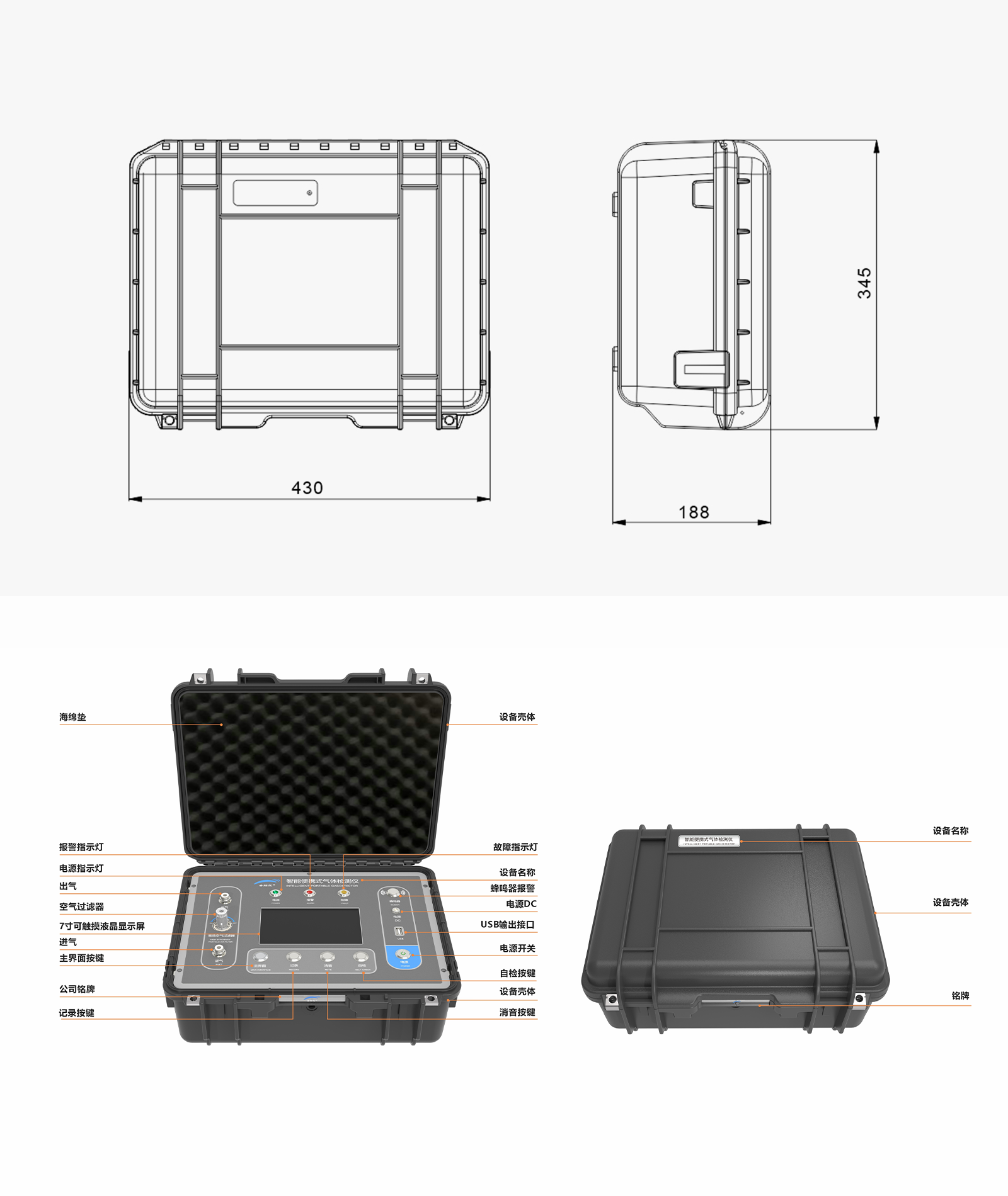 ☆ 七寸彩色高清觸摸液晶顯示屏,可顯示檢測數據、報警信息、時間、溫度、存儲、電量、充電狀態(tài)等信息,對設備進行調節(jié)設置。